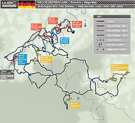 Astfel, chiar dacă 14 dintre cele 15 probe speciale au suferit unele modificări minore, structura raliului rămâne în mare parte aceeaşi. Raliul va începe propriu-zis vineri cu primele şase probe speciale din regiunea viticolă Mosel înainte de a aborda de două ori celebra probă specială Panzerplatte cu o lungime de 46.54 km din apropierea unităţii militare de la Baumholder pe parcursul zilei de sâmbătă. Duminică, echipajele vor reveni la Mosel, însă finalul este programat pe străzile oraşului Trier cu ocazia Power Stage-ului care aduce puncte suplimentare pentru piloţi.